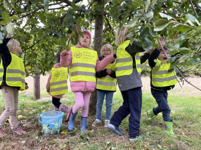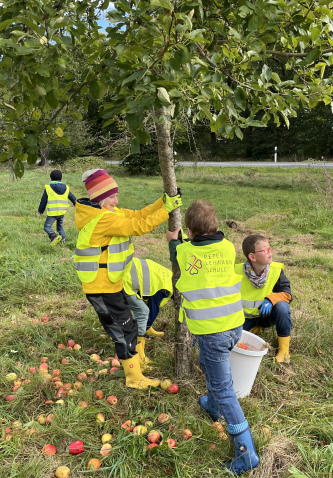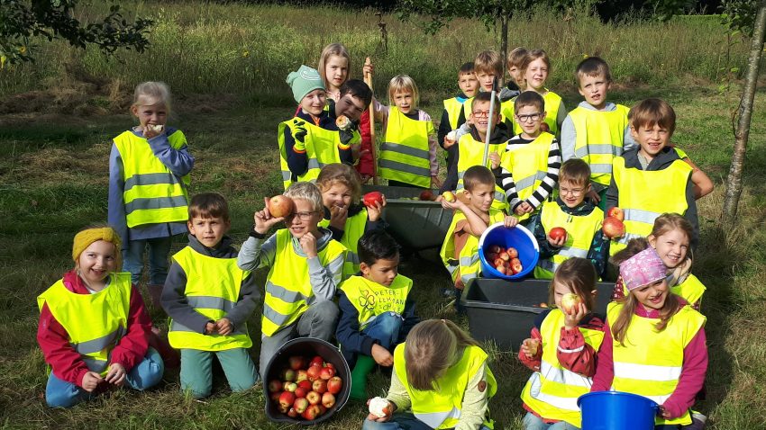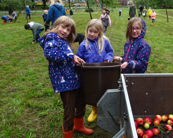 In der letzten Woche vor den Herbstferien waren die Kinder der Klassen 1 und 2 wieder auf der Apfelwiese von Familie Westphal anzutreffen, denn dort sammelten sie eifrig Äpfel für Ollis mobile Saftpresse. Herzlichen Dank an dieser Stelle an Familie Westphal, die wieder einmal ihre Apfelbäume und das Material zum Pflücken und Sammeln bereitstellten.