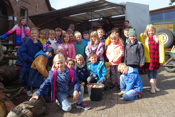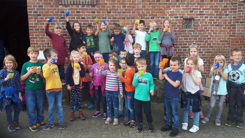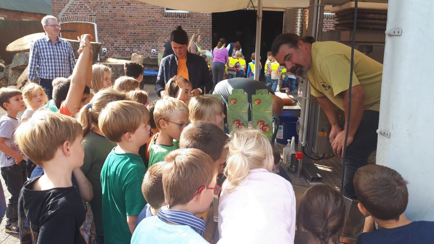 Am letzten Schultag ging es dann zum Hof Lueken, auf dem Olli, der auf Einladung des Bürgervereins Sage, Haast und Bissel nach Sage kam, bereits mit seiner mobilen Saftpresse auf uns wartete. Er erklärte den Kindern, welche Schritte notwendig sind, um aus den festen Früchten haltbaren Saft herzustellen. So konnten die Kinder Schritt für Schritt den Weg vom reifen Apfel zum Apfelsaft erleben und sogar selbst mit Hand anlegen. Anschließend ließ sich jeder eine Kostprobe des frisch gepressten Streuobstwiesen – Apfelsaftes schmecken.