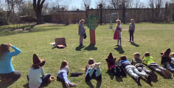 Gleich in der zweiten Schulwoche nach den Sommerferien hieß es „Anschnallen und die Rückenlehne aufrecht stellen“, denn wir machten uns auf den Weg nach Afrika, genauer gesagt nach Tamborena, dem Trommelzauber-Dorf in Afrika. Amadou, unser Reiseleiter und zugleich Trommelzauberer, begleitete uns auf dieser spannenden Reise. Jeden Morgen versammelten sich alle Kinder in der Aula und trafen unter Anleitung von Amadou spannende und musikalische Vorbereitungen. Dazu gehörte das Lernen der Sprache der Trommeln, die Kommunikation mit Tieren, Kofferpacken, ein Fitness- und Überlebenstraining und das korrekte Verhalten in Notfällen. Auch wird ein Geschenk, das weder etwas kostet noch etwas wiegt, aber Freude macht und überrascht, für die Kinder im Trommelzauberdorf vorbereitet. Alle Kinder wirkten aktiv mit und übernahmen neben ihrer Rolle als Reisende auch eine Tierrolle.
