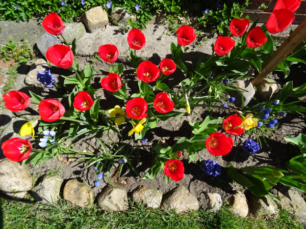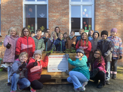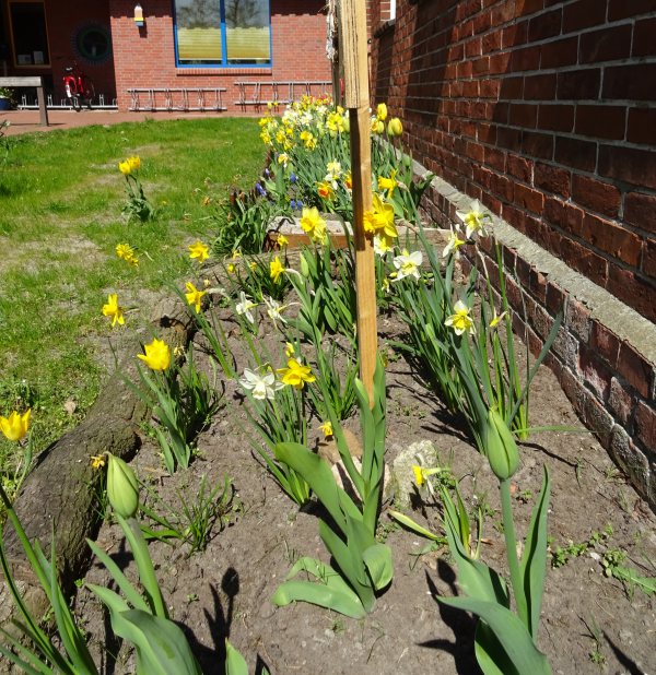 Alle Kinder der Peter-Lehmann-Schule haben mit tatkräftiger Unterstützung von Kerstin Seeger das Beet vor dem Klassenraum der Klasse 1 mit vielen schönen Frühblühern verschönert – ein toller Anblick!