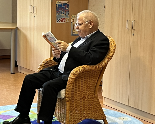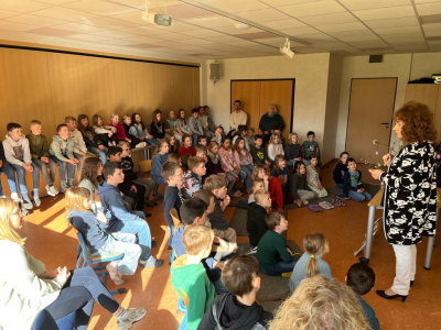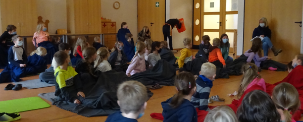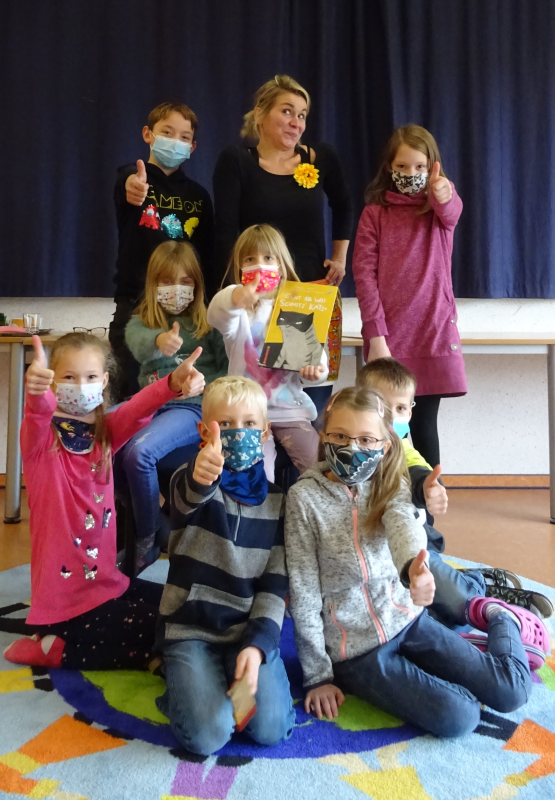 Die Schülerinnen und Schüler der Klassen 1 bis 4 hatten es sich auf Teppichen und Matten mit Wolldecken gemütlich gemacht und hörten gespannt zu. Immer wieder brach schallendes Gelächter bei der brüllend komischen und lebensnahen Lesung aus, zum Beispiel als die „Schnittenschneebälle“ (zusammengequetschte Butterbrote) oder Untertassen durch die Küche flogen. Im Anschluss durften die Kinder ihre Fragen loswerden und erhielten alle ein Lesezeichen. Jetzt wird die Bücherei der Schule um ein Buch reicher, da alle Beteiligten neugierig auf das Ende sind.