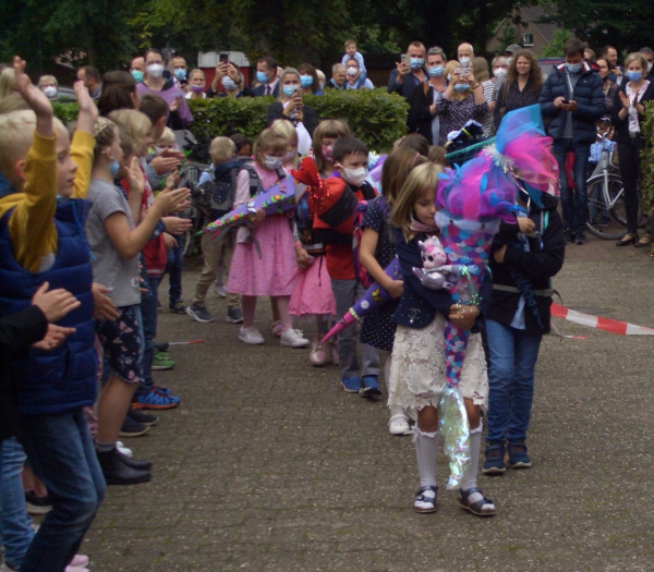 Am Samstag, den 04.09. 2021 war es endlich soweit. Wir durften 20 Erstklässler bei uns in der Schule willkommen heißen. Mit einem Einschulungsgottesdienst in der Kirche in Großenkneten startete der aufregende Tag. Anschließend ging es für die Kinder mit ihren Familien zur Schule, wo sie von den Kindern der Klassen 2 – 4 freudig in einem Spalier begrüßt wurden.