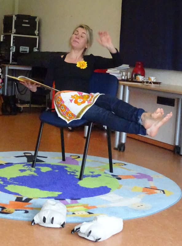 Hierbei ging es um Familie Schmitz – eine ganz normale Familie, bis zu dem Morgen, als die Katze in die Küche gekotzt hat. Grund für die Mutter, in dem Kinderbuch in den Streik zu treten. Sehr humorvoll erzählte die mehrfach prämierte Autorin (2020 und 2021 als „Lesekünstlerin des Jahres“ ausgezeichnet) aus Dresden vom Streik der Mutter aus Sicht des Sohnes. Von dem einen Tag auf den anderen finden sich der Vater und die Kinder in einer Ausnahmesituation wieder: Kein frisches Essen mehr auf dem Tisch, keine gewaschene Wäsche und einen leeren Kühlschrank. Die Mama macht es sich im Garten gemütlich und beobachtet, wie das Chaos in der Familie seinen Lauf nimmt.
