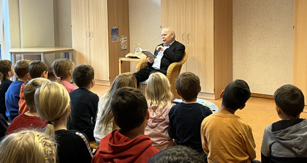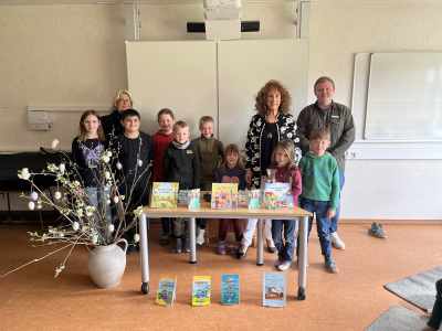 Möglich wurde die Veranstaltung Dank des Landkreises Oldenburg. Der Vertreter Claas Schöbel, Fachstelle Klimaschutz, Klimaanpassung und Nachhaltigkeit, verteilte im Anschluss an die Lesung an alle teilnehmenden Kinder unserer Schule das Buch „Ist unser Wald in Gefahr?“.