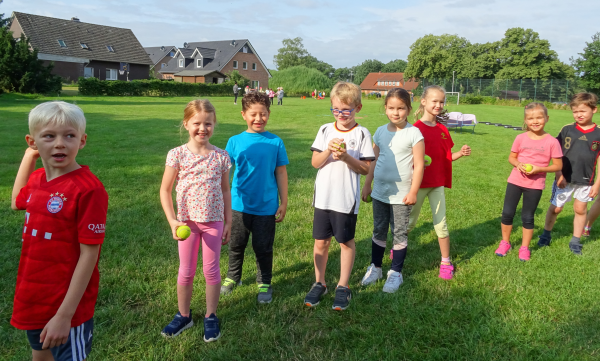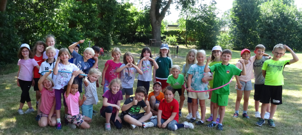Bei bestem Sportlerwetter fand am 19.07.2021 unser Sportfest statt, welches mit kleinen Aufwärmübungen startete. Richtig warm wurde nicht nur den Kindern, sondern auch den Lehrerinnen, als das Lied „Theo Theo“ zu hören war und alle motiviert mittanzten. Anschließend zeigten die Kinder in kleinen Gruppen an Stationen wie „Schwammstaffel“, „Hindernislauf“ oder „Eiswaffeltransport“ ihr Geschick und ihre Ausdauer. Zum Abschluss des Sportfestes nahmen alle Kinder glücklich und stolz ihre Urkunden in Empfang.