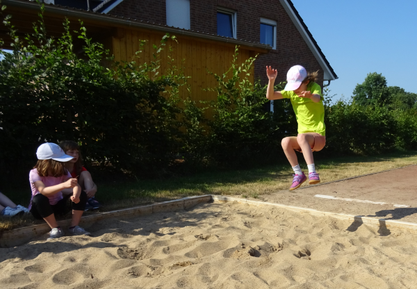 Danach durchliefen die Kinder in Gruppen die einzelnen Stationen, wobei die Mädchen der Klasse 1 und 2, die Jungen der Klasse 1 und 2, die Mädchen der Klasse 3 und 4 sowie die Jungen der Klasse 3 und 4 eine Gruppe bildeten. Bei gutem Wetter zeigten die Kinder, wie schnell sie laufen, wie weit sie springen und wie weit sie werfen können. Angefeuert wurden sie dabei nicht nur durch die eigenen Gruppenmitglieder, sondern auch von den fleißigen „Eltern-Helfern“ an den einzelnen Stationen.