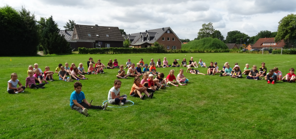 Am vergangenen Freitag trafen sich alle Schülerinnen und Schüler auf dem Sportplatz, um gemeinsam die Bundesjugendspiele zu absolvieren. Dafür wurden verschiedene Wettkampstationen aufgebaut. Neben den Stationen für den Wettbewerb Leichtathletik, der sich aus den Bereichen „schnell laufen“, „weit/hoch springen“, „weit werfen/stoßen“ und „ausdauernd laufen“ zusammensetzt, gab es weitere Spielstationen, wie „Dosen werfen“, „Zielwerfen am Fußballtor“, „Wäscheleinen – Handtuch – Lauf“ und „Wanderung des Reifens & Klassenreise“.
