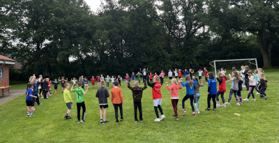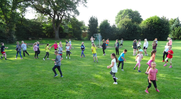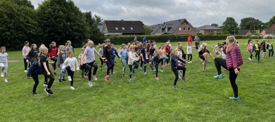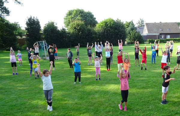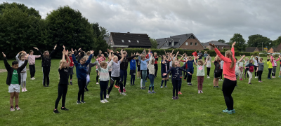 Bevor es an die einzelnen Stationen ging, gab es unter der Anleitung von Frau Spichartz-Grübbel ein tolles Aufwärmprogramm zu fetziger Musik.