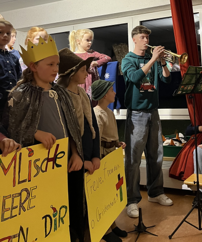 Ein besonderer Moment der Feier war der gemeinsame Abschluss: Alle Kinder versammelten sich auf der Bühne und sangen zusammen mit den Gästen das Lied „Oh du fröhliche“. Unser Bundesfreiwilligendienstleistender Tarek stimmte das Lied ein, indem er zunächst eine Strophe ganz allein auf der Trompete spielte. Ein eindrucksvoller Auftakt und ein echtes Highlight der Weihnachtsfeier.