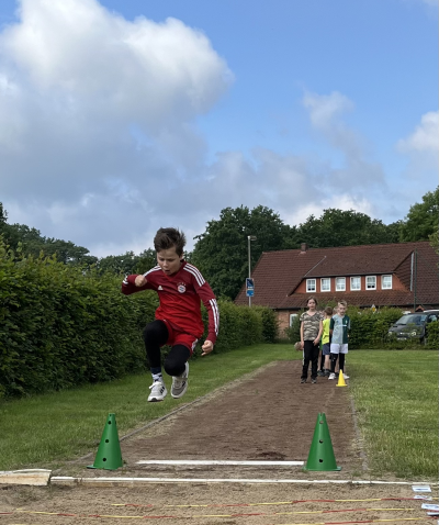 Am Freitag, den 06.06.2025 fanden an unserer Grundschule die Bundesjugendspiele statt. Die Kinder absolvierten die klassischen Disziplinen Weitwurf, Weitsprung und Sprint sowie einen Langlauf und zeigten dabei großen Einsatz und sportlichen Ehrgeiz. Damit es beim Wechsel von einer Disziplin zur nächsten keine langen Wartezeiten gab, warteten weitere zusätzliche Stationen wie Torwandschießen, Hürdenlauf und Dosenwerfen auf die Kinder. Auch diese wurden mit Begeisterung absolviert.