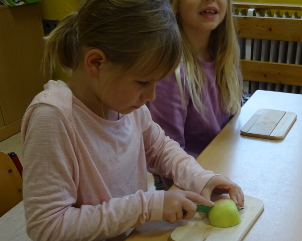 Dank weiterer zahlreicher Apfelspenden konnte am Freitag ausreichend Saft gepresst werden. Hier erklärte Oliver Schmale den Kindern, welche Schritte notwendig sind, um aus den festen Früchten haltbaren Saft herzustellen. So konnten die Kinder Schritt für Schritt den Weg vom reifen Apfel zum Apfelsaft erleben und sogar selbst mit Hand anlegen. Anschließend ließ sich jeder eine Kostprobe des frisch gepressten Streuobstwiesen – Apfelsaftes schmecken.