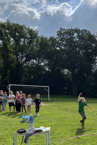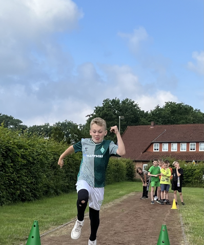 Am Freitag, den 06.06.2025 fanden an unserer Grundschule die Bundesjugendspiele statt. Die Kinder absolvierten die klassischen Disziplinen Weitwurf, Weitsprung und Sprint sowie einen Langlauf und zeigten dabei großen Einsatz und sportlichen Ehrgeiz. Damit es beim Wechsel von einer Disziplin zur nächsten keine langen Wartezeiten gab, warteten weitere zusätzliche Stationen wie Torwandschießen, Hürdenlauf und Dosenwerfen auf die Kinder. Auch diese wurden mit Begeisterung absolviert.