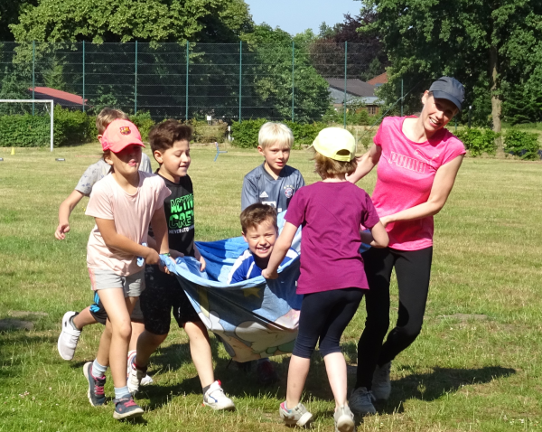 Bei bestem Sportlerwetter fand am 19.07.2021 unser Sportfest statt, welches mit kleinen Aufwärmübungen startete. Richtig warm wurde nicht nur den Kindern, sondern auch den Lehrerinnen, als das Lied „Theo Theo“ zu hören war und alle motiviert mittanzten. Anschließend zeigten die Kinder in kleinen Gruppen an Stationen wie „Schwammstaffel“, „Hindernislauf“ oder „Eiswaffeltransport“ ihr Geschick und ihre Ausdauer. Zum Abschluss des Sportfestes nahmen alle Kinder glücklich und stolz ihre Urkunden in Empfang.