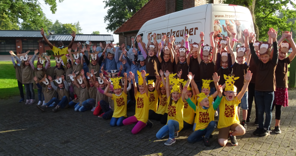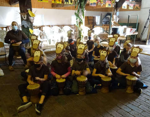 Am Freitagnachmittag (17.09.) war es dann endlich soweit – die Eltern waren eingeladen und durften am großen Fest in Tamborena teilnehmen. Familie Küther aus Sage hatte dankenswerterweise ihre Diele für die musikalische Fantasiereise zur Verfügung gestellt. Aufgeregt wurden die selbstgebastelten Masken aufgesetzt, die gefärbten T-Shirts angezogen und die Trommeln aufgebaut. Als der Trommelzauberer loslegte, zeigten alle mit großem Engagement und viel Freude ihr Können.