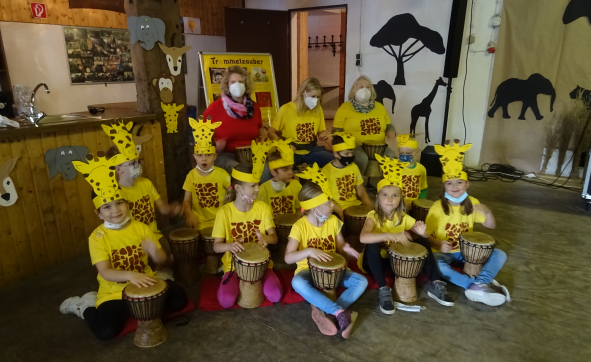 So trampelten die 3. Klässler als Elefanten durch die Schule, in der 4. Klassen waren die Affen los und die Zweitklässler hatten als Giraffe einen langen Hals. Die Jüngsten der Schule waren die Gazellen, die gleich in ihrer zweiten Schulwoche mit vollem Einsatz dabei waren. Auch wenn die Ankündigung nach Afrika zu fliegen bei einigen Kindern für kurzes Entsetzen sorgte. Wenn gerade nicht getrommelt wurde, lernten die Kinder das Land Afrika kennen, sammelten Informationen über ihr Tier, bastelten an ihrer Tiermaske oder der Dekoration.