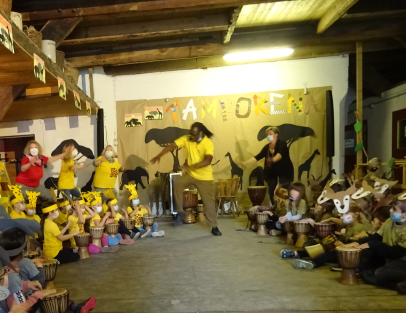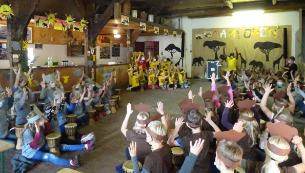 Gleich in der zweiten Schulwoche nach den Sommerferien hieß es „Anschnallen und die Rückenlehne aufrecht stellen“, denn wir machten uns auf den Weg nach Afrika, genauer gesagt nach Tamborena, dem Trommelzauber-Dorf in Afrika. Amadou, unser Reiseleiter und zugleich Trommelzauberer, begleitete uns auf dieser spannenden Reise. Jeden Morgen versammelten sich alle Kinder in der Aula und trafen unter Anleitung von Amadou spannende und musikalische Vorbereitungen. Dazu gehörte das Lernen der Sprache der Trommeln, die Kommunikation mit Tieren, Kofferpacken, ein Fitness- und Überlebenstraining und das korrekte Verhalten in Notfällen. Auch wird ein Geschenk, das weder etwas kostet noch etwas wiegt, aber Freude macht und überrascht, für die Kinder im Trommelzauberdorf vorbereitet. Alle Kinder wirkten aktiv mit und übernahmen neben ihrer Rolle als Reisende auch eine Tierrolle.